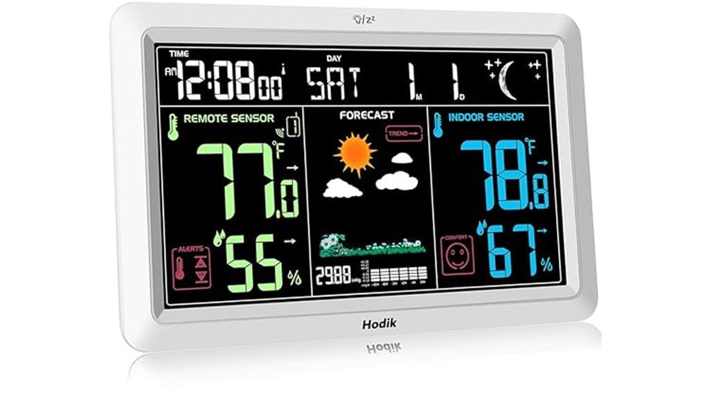 Featuring a 7.6-inch display, this weather station is perfect for anyone who wants precise indoor and outdoor temperature readings at a glance. It displays temperature, humidity, barometric pressure, and even the moon phase, making it an all-encompassing tool for weather monitoring. With its atomic clock functionality, I never have to worry about setting the time manually—it syncs automatically. The wireless range is impressive, allowing me to use up to three sensors around my property. Setup is straightforward, and the bright, high-contrast display guarantees I can read it from across the room. This station truly enhances my weather prediction experience!