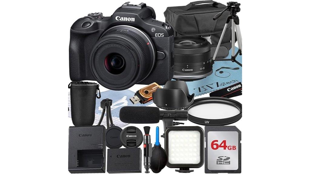 The Canon EOS R100 Mirrorless Camera Bundle is an ideal choice for photography enthusiasts who value portability without sacrificing image quality. It features a compact design, making it perfect for travel and street photography. With a 24.1 MP APS-C CMOS sensor, I’ve captured vibrant colors and sharp details effortlessly. The RF-S 18-45mm lens offers versatility, covering a 29-72mm focal range. I appreciate the Dual Pixel Autofocus for quick and accurate focusing, along with smooth 1080p video recording. Plus, built-in Wi-Fi and Bluetooth make sharing a breeze. This bundle even includes a memory card and accessories—everything I need to get started!